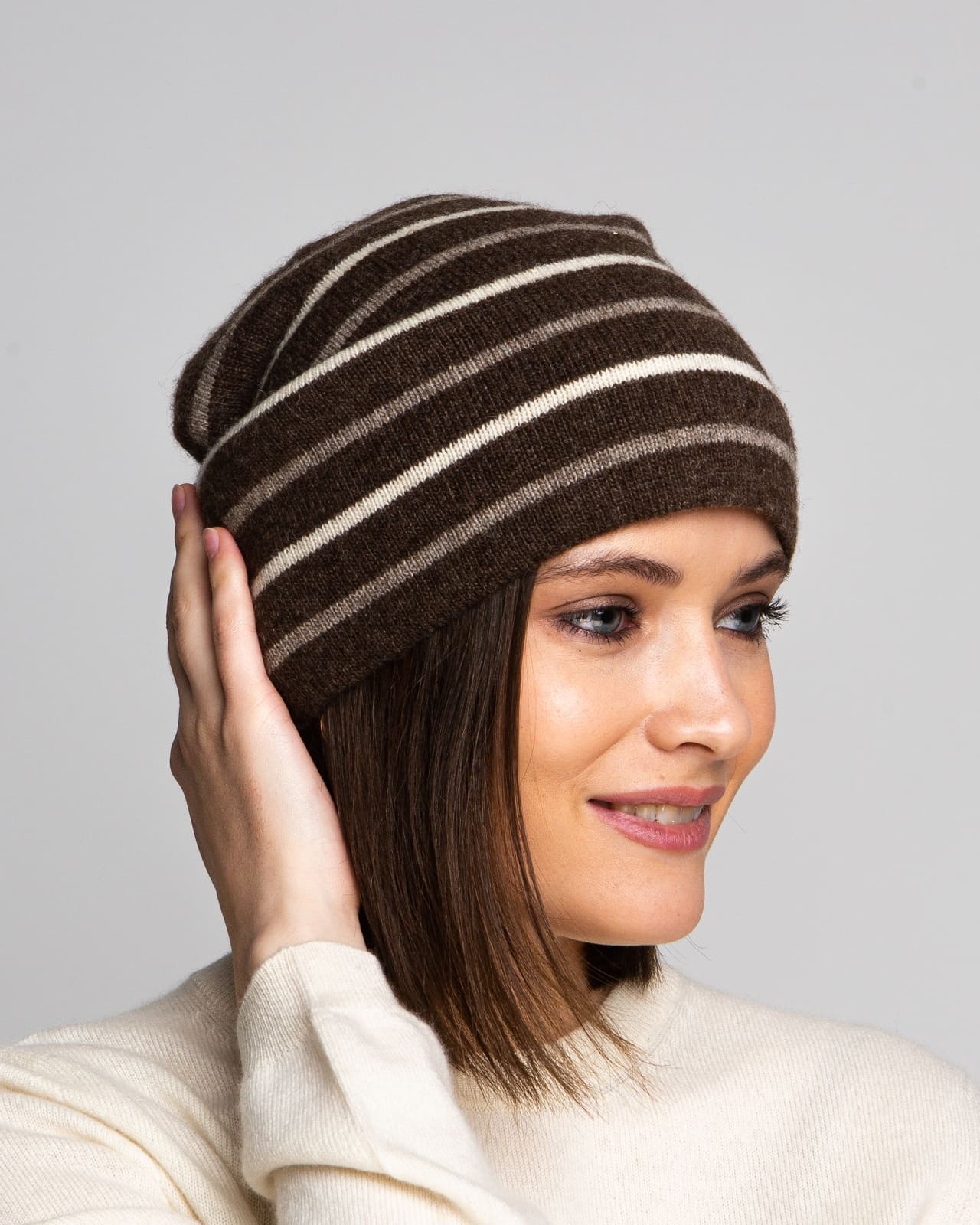 Шапка 7M11030 из шерсти яка — стильная модель с лаконичным дизайном и выразительным полосатым узором. Контрастные горизонтальные линии придают аксессуару динамичность и современный характер. Мягкая фактура и удлинённый силуэт делают шапку универсальным решением для повседневных образов в холодное время года.