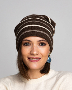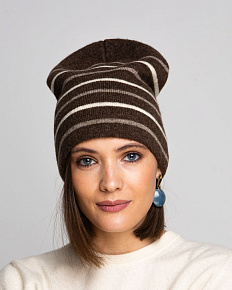 Красивая темно-коричневая шапка с полосками. которые ее очень украшают.