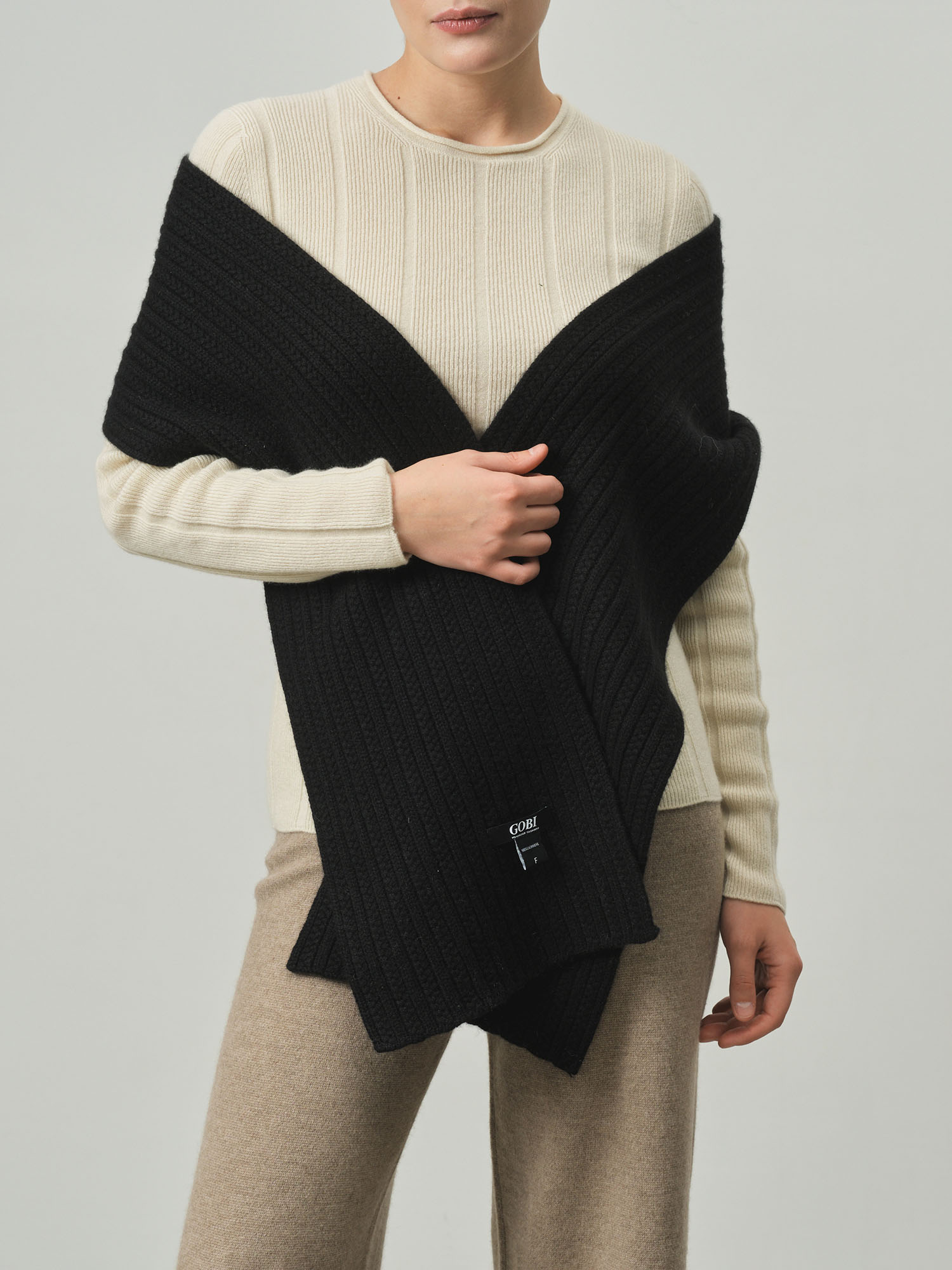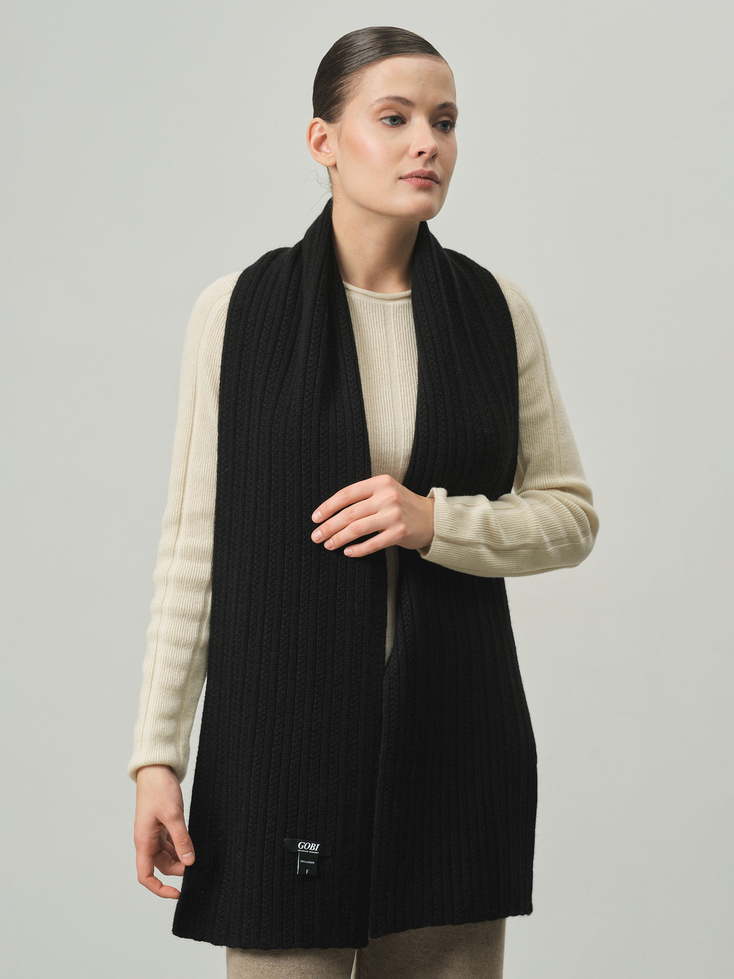 Классическая прямоугольная форма с фактурной вязкой в рубчик. Минималистичный дизайн подчёркивает благородную текстуру кашемира и делает аксессуар универсальным для разных стилей.