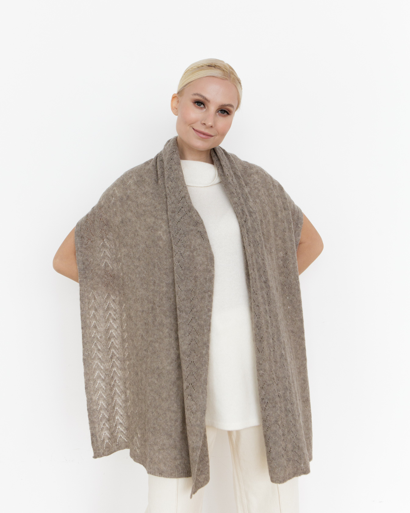 Легкий, мягкий и приятный к коже палантин хорошо драпируется и позволяет создавать различные способы ношения. Подходит для повседневных и деловых образов.