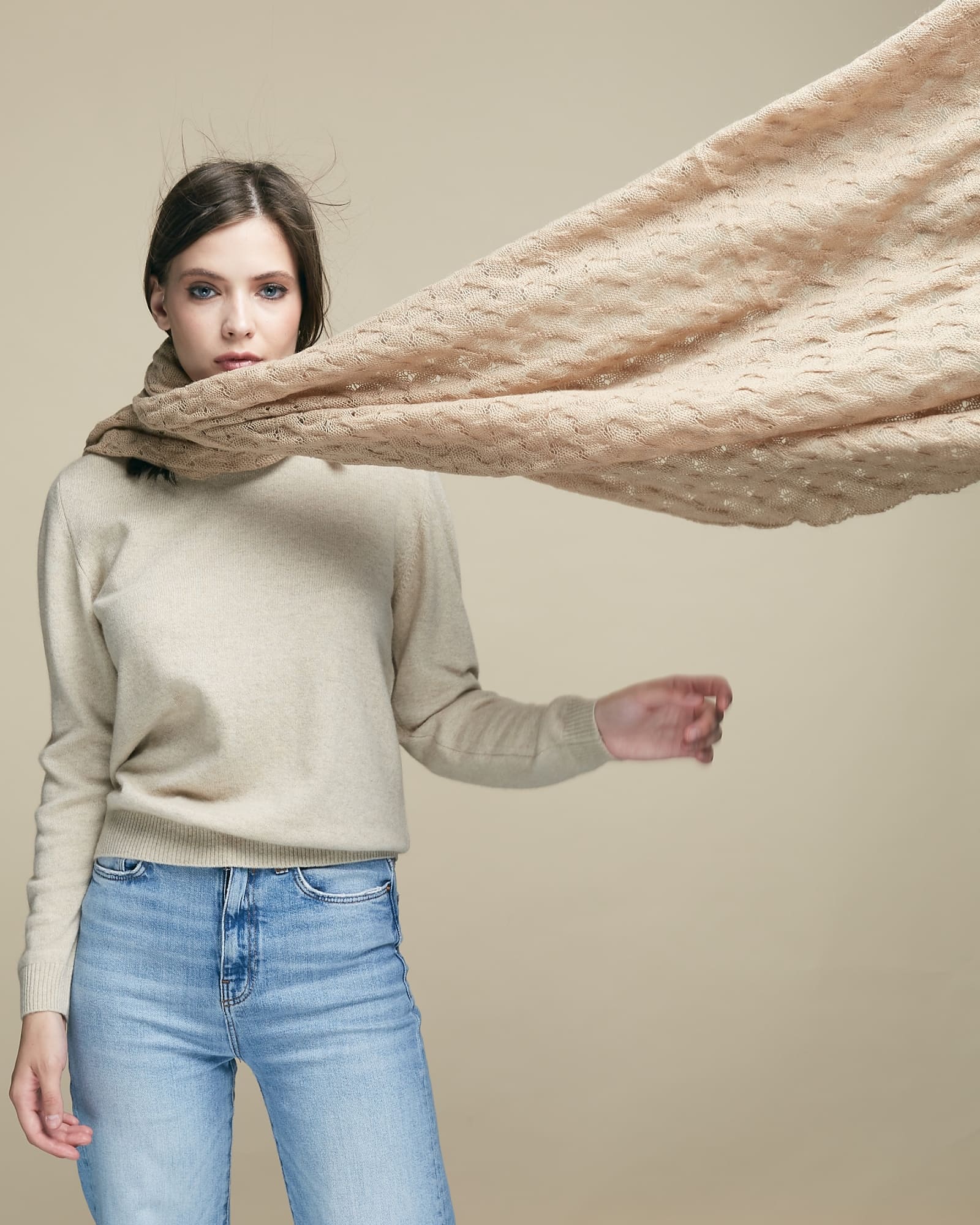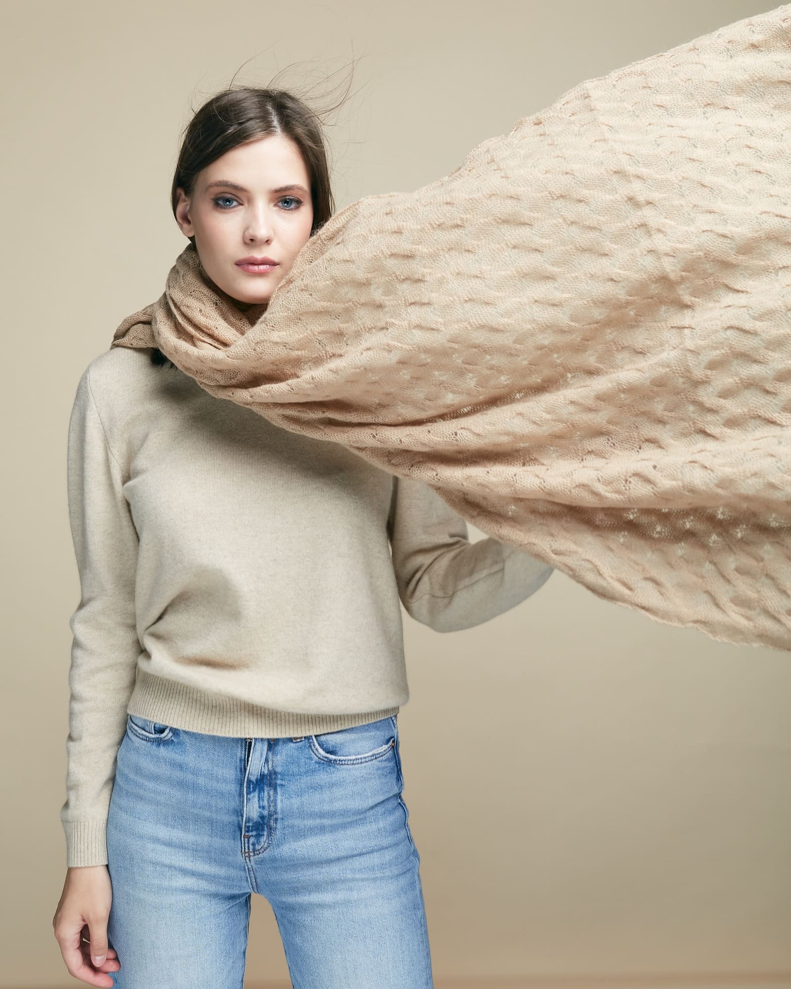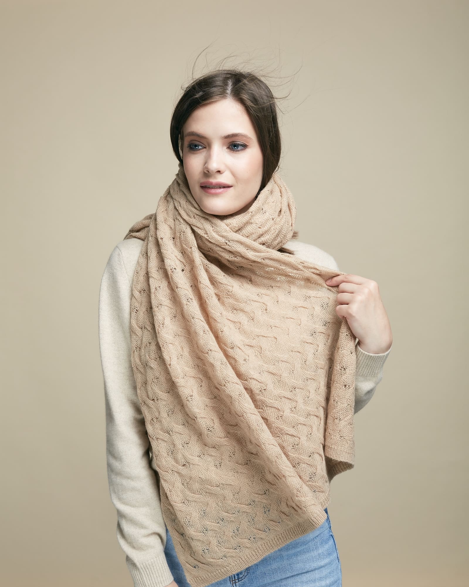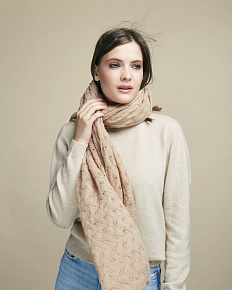 Палантин выполнен в классической прямоугольной форме с изящной ажурной вязкой. Фактурный узор придаёт изделию выразительность и визуальную лёгкость. Полотно мягко струится и образует аккуратные складки, создавая элегантную драпировку.