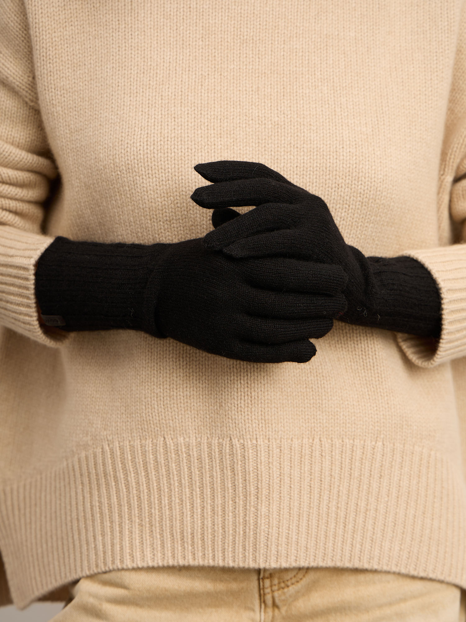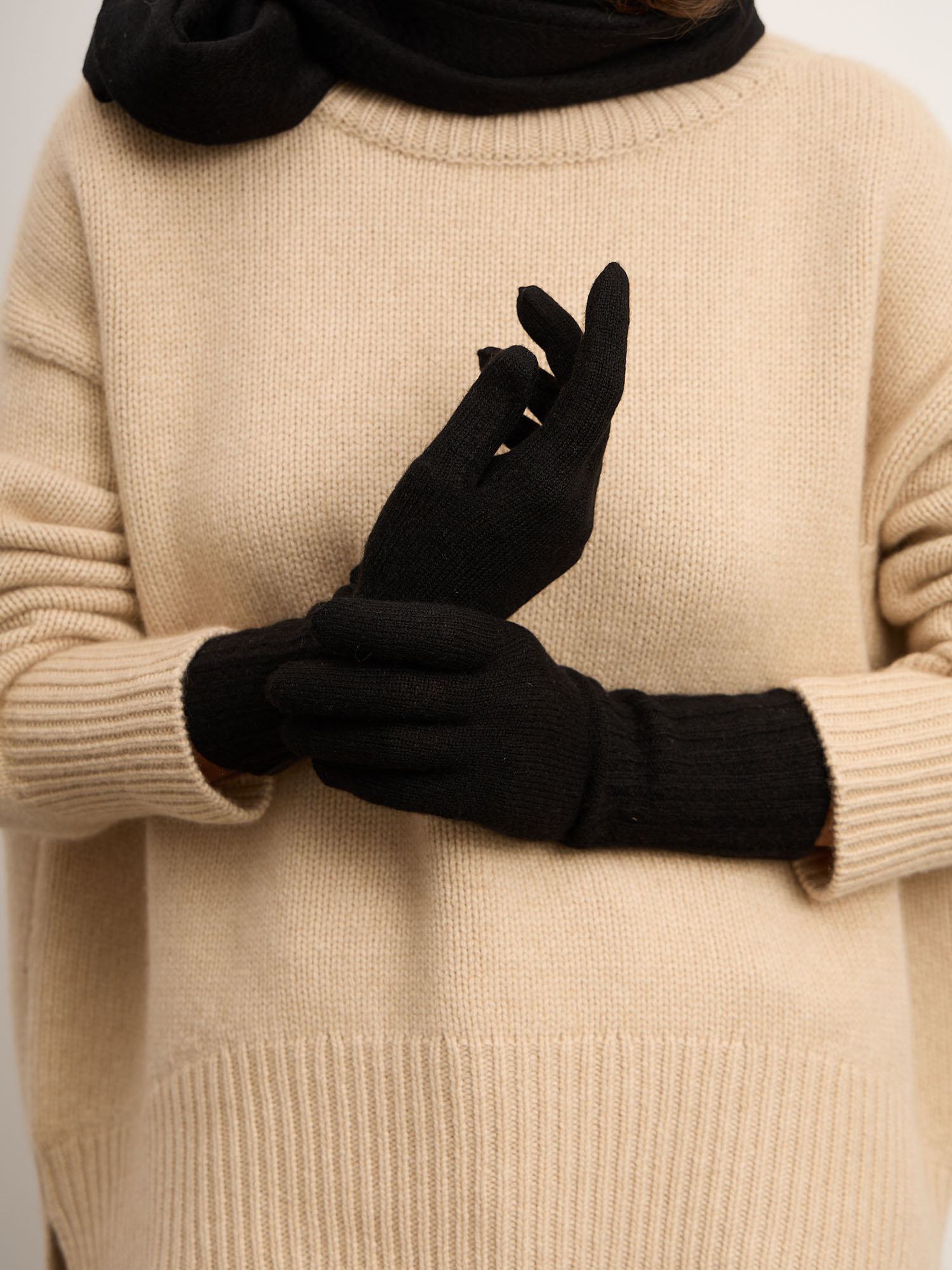 Перчатки выполнены из тонкого, но плотного кашемирового трикотажа с мягкой резинкой на запястье. Натуральный кашемир обладает исключительными теплоизоляционными свойствами, не раздражает кожу и подходит даже для самой чувствительной. Чёрный цвет придаёт образу строгость и универсальность, идеально дополняя как повседневные, так и классические наряды.