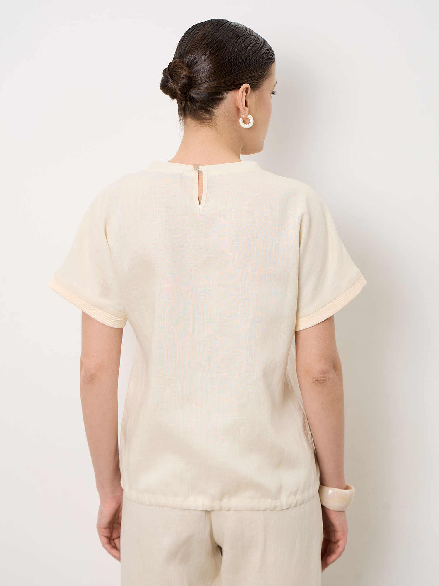 Свободная посадка обеспечивает комфорт и свободу движений. Лёгкая натуральная ткань приятно ощущается на коже и подходит для длительной носки в течение дня.