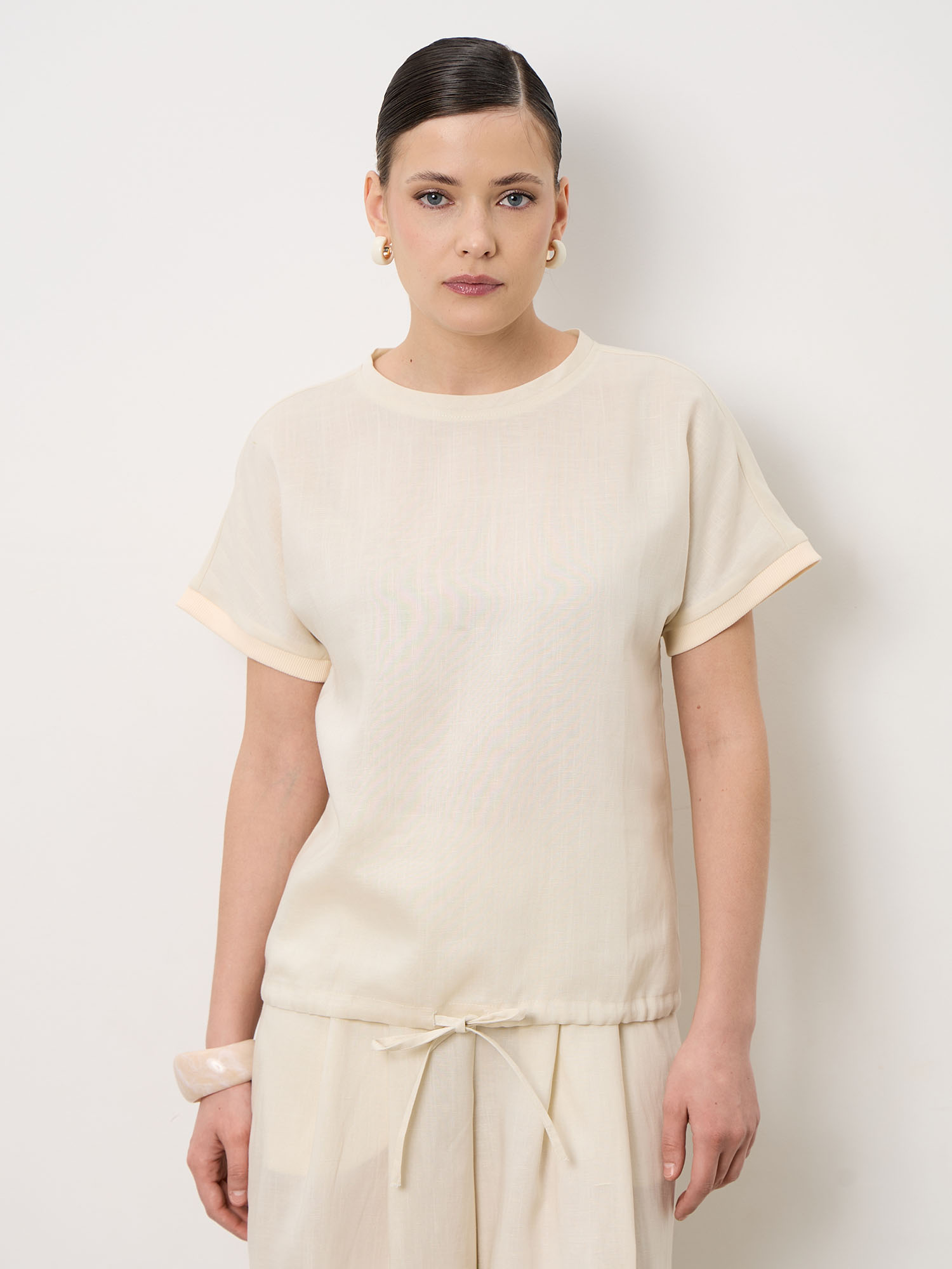 Минималистичный дизайн с аккуратным круглым вырезом и короткими рукавами. Свободный крой и чистые линии подчёркивают современную эстетику и делают модель универсальной для различных образов.