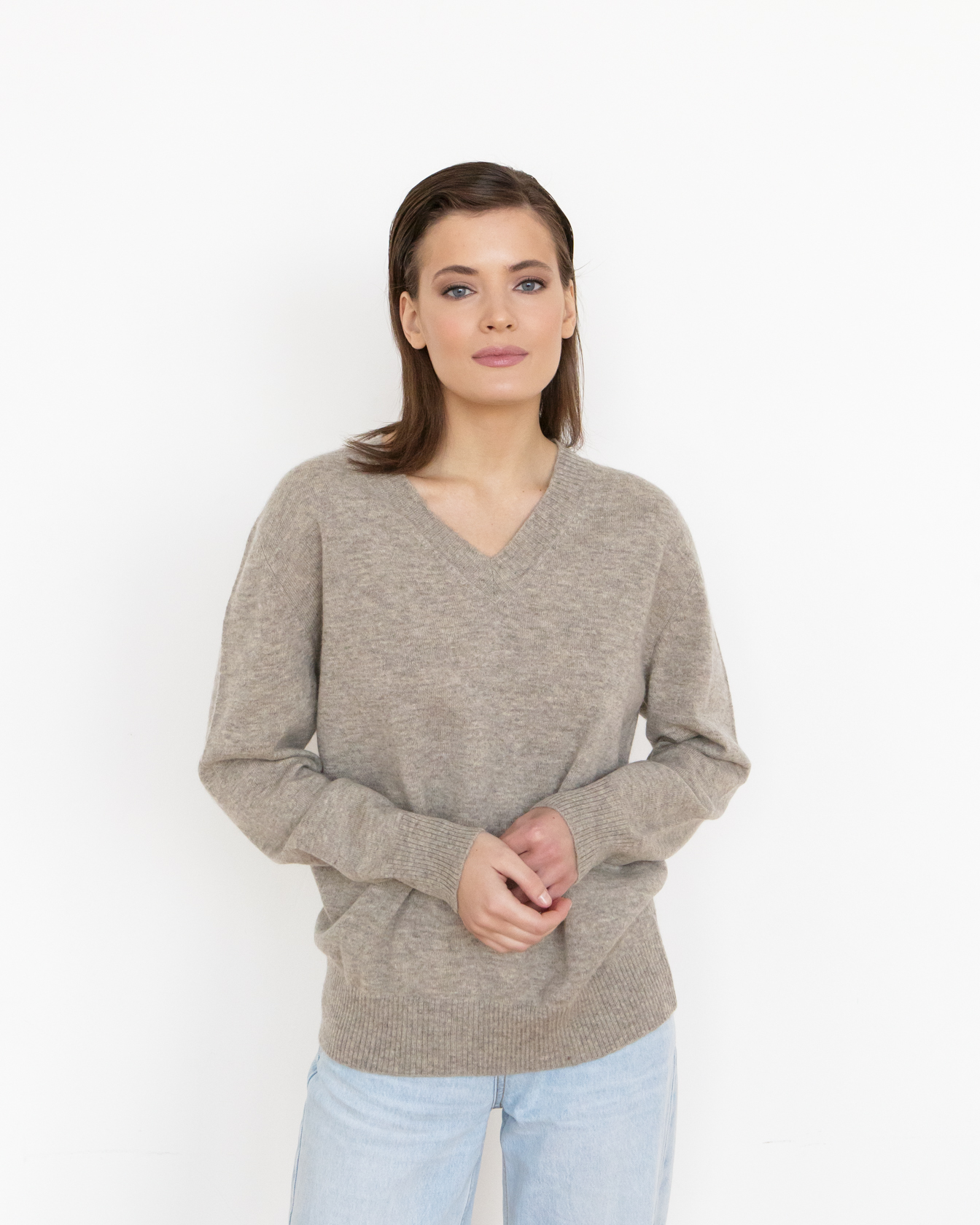 V-образная горловина, аккуратная трикотажная отделка манжет и нижнего края изделия. Ровная вязка сохраняет форму и подчёркивает аккуратность силуэта.