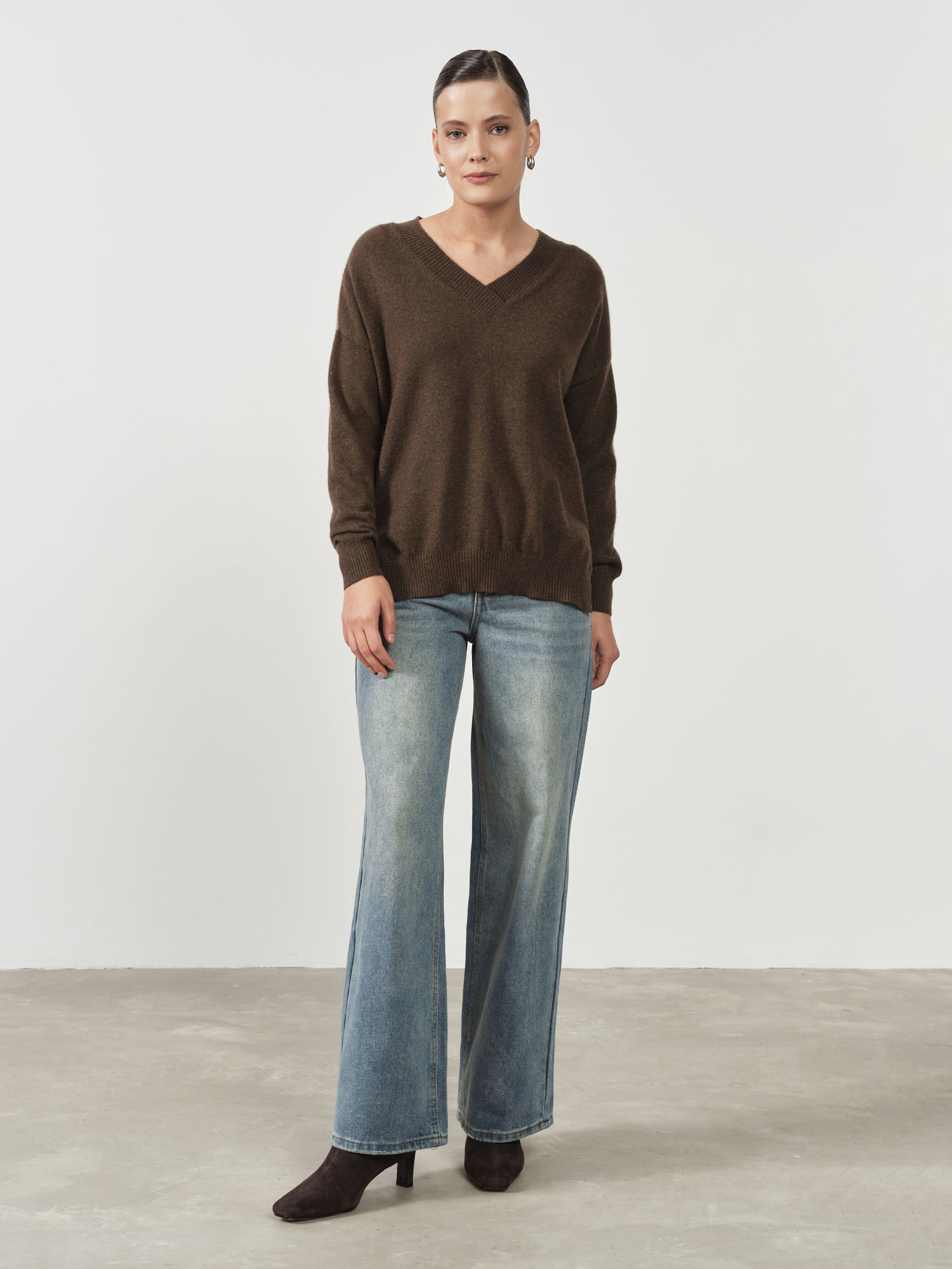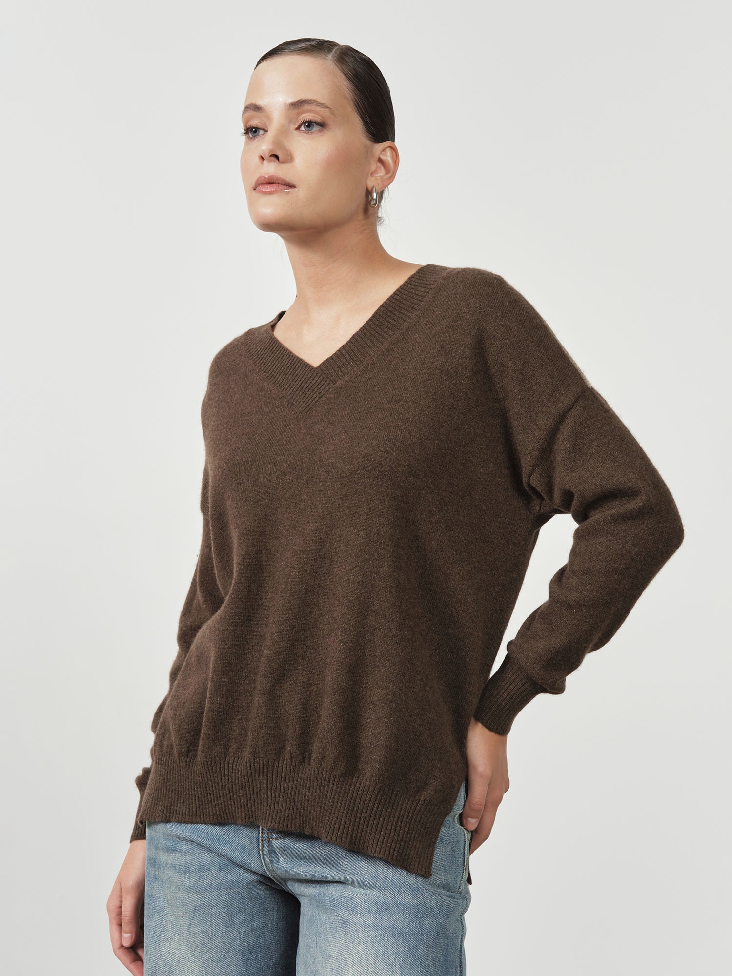 Модель выполнена в минималистичном стиле с V-образным вырезом и длинными рукавами. Свободный крой подчёркивает современный силуэт и делает джемпер удобным для повседневной носки.