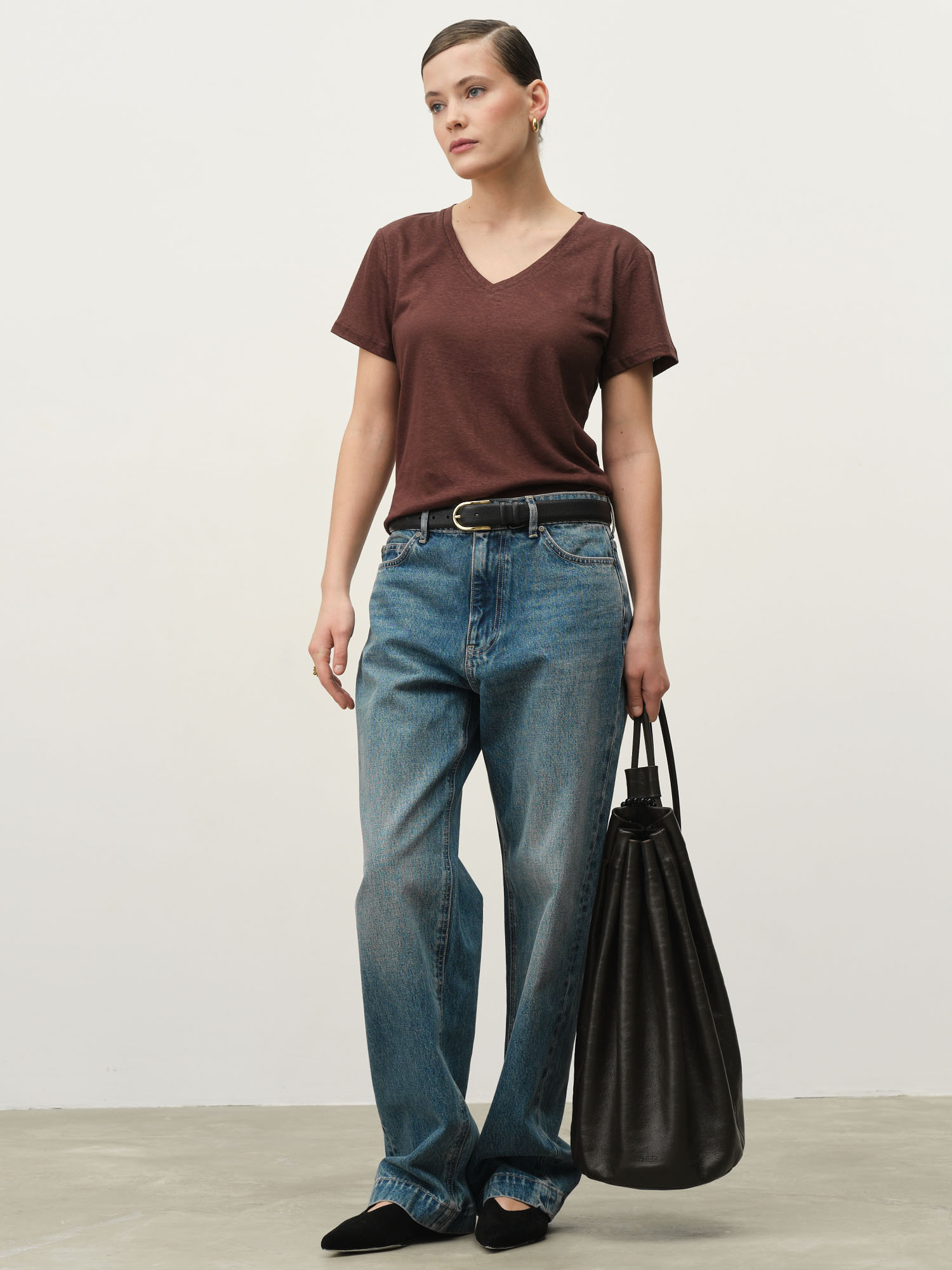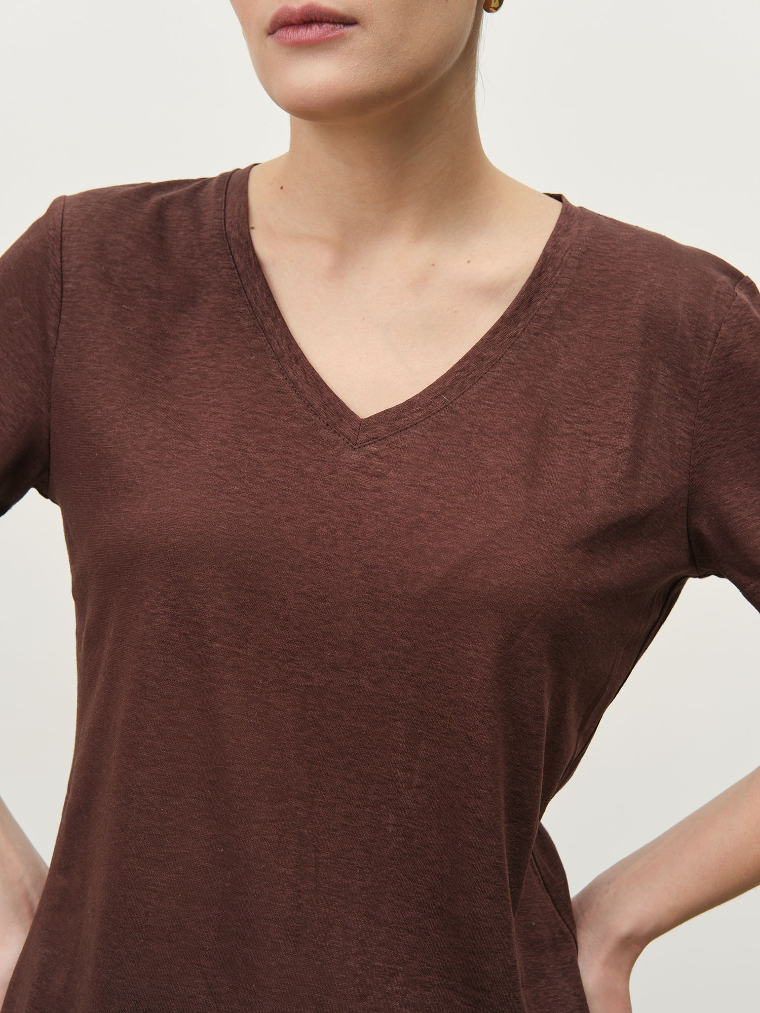 Футболка из крапивы в насыщенном шоколадном оттенке — стильное и экологичное решение. Натуральный материал дарит комфорт и хорошую воздухопроницаемость. V-образный вырез подчеркивает линию шеи и добавляет элегантности. Идеальна для повседневного гардероба.