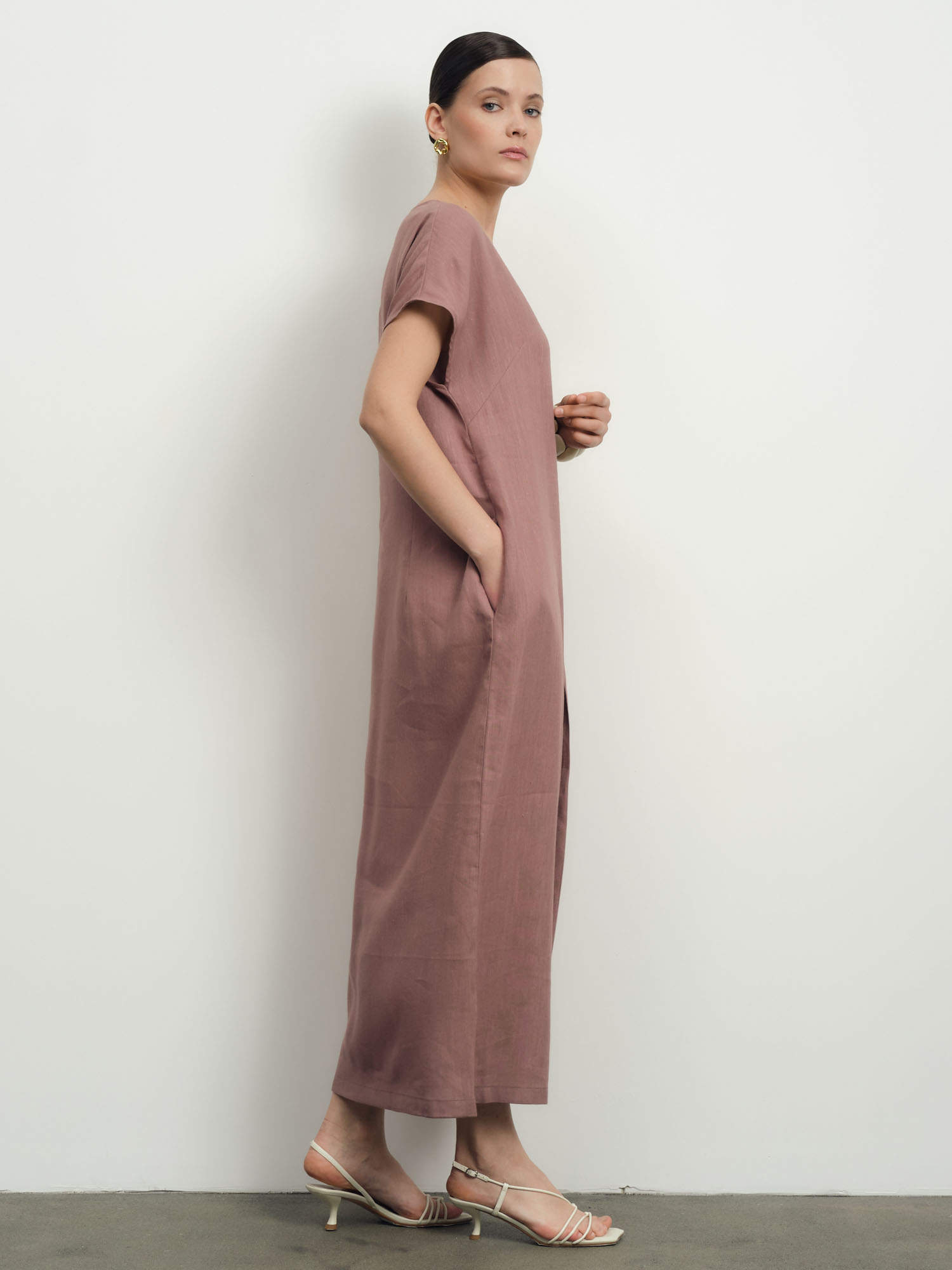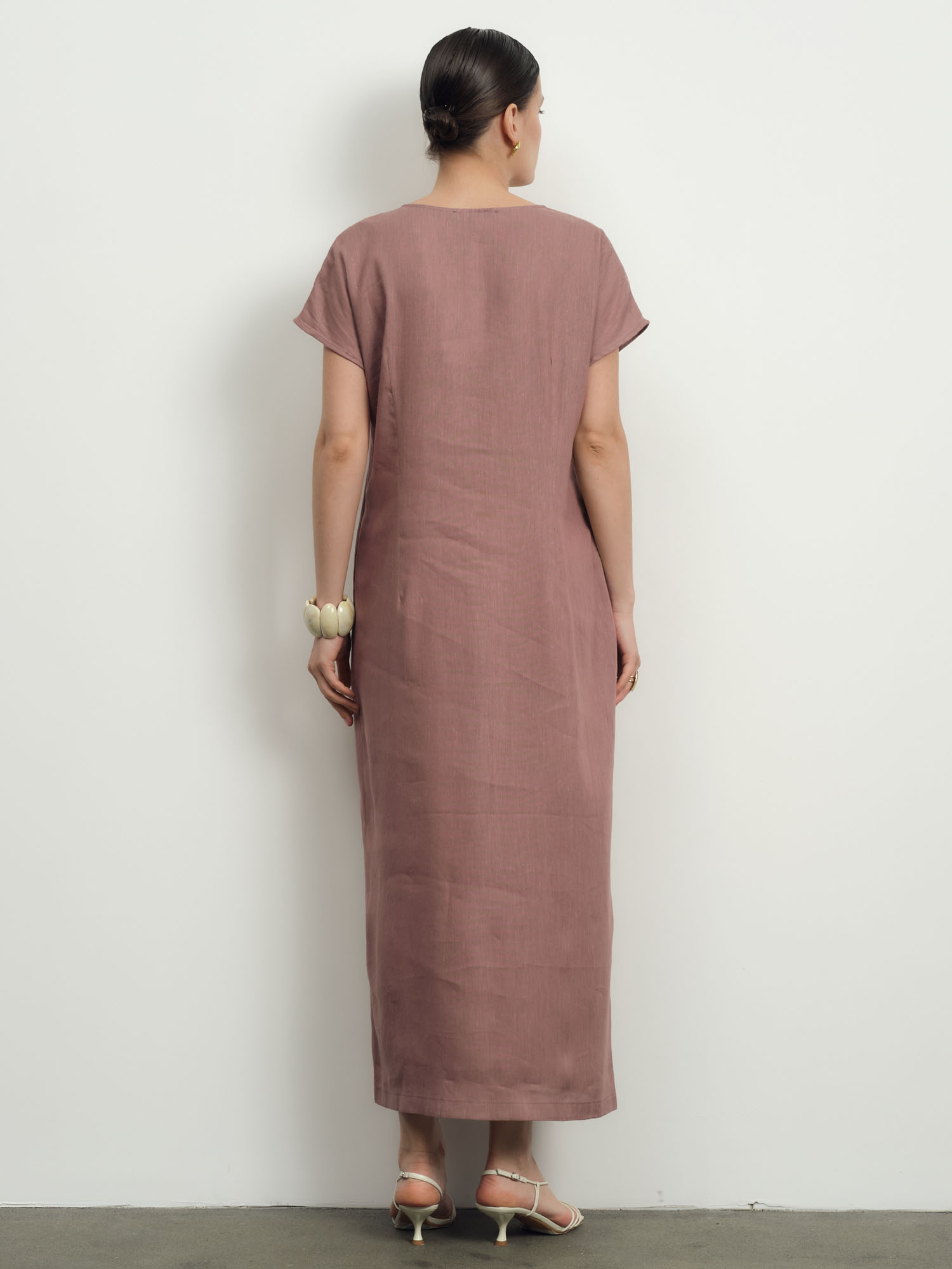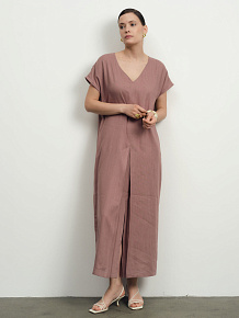 Прямой силуэт длины миди с V-образным вырезом и короткими рукавами. Лаконичный крой подчеркивает естественность и современный стиль.