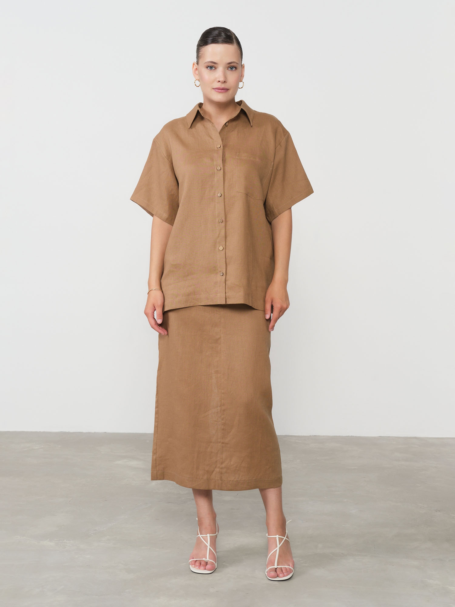 Пояс с аккуратной посадкой, шлёвки, задний разрез для свободы движения, чистые швы, натуральная текстура ткани.
