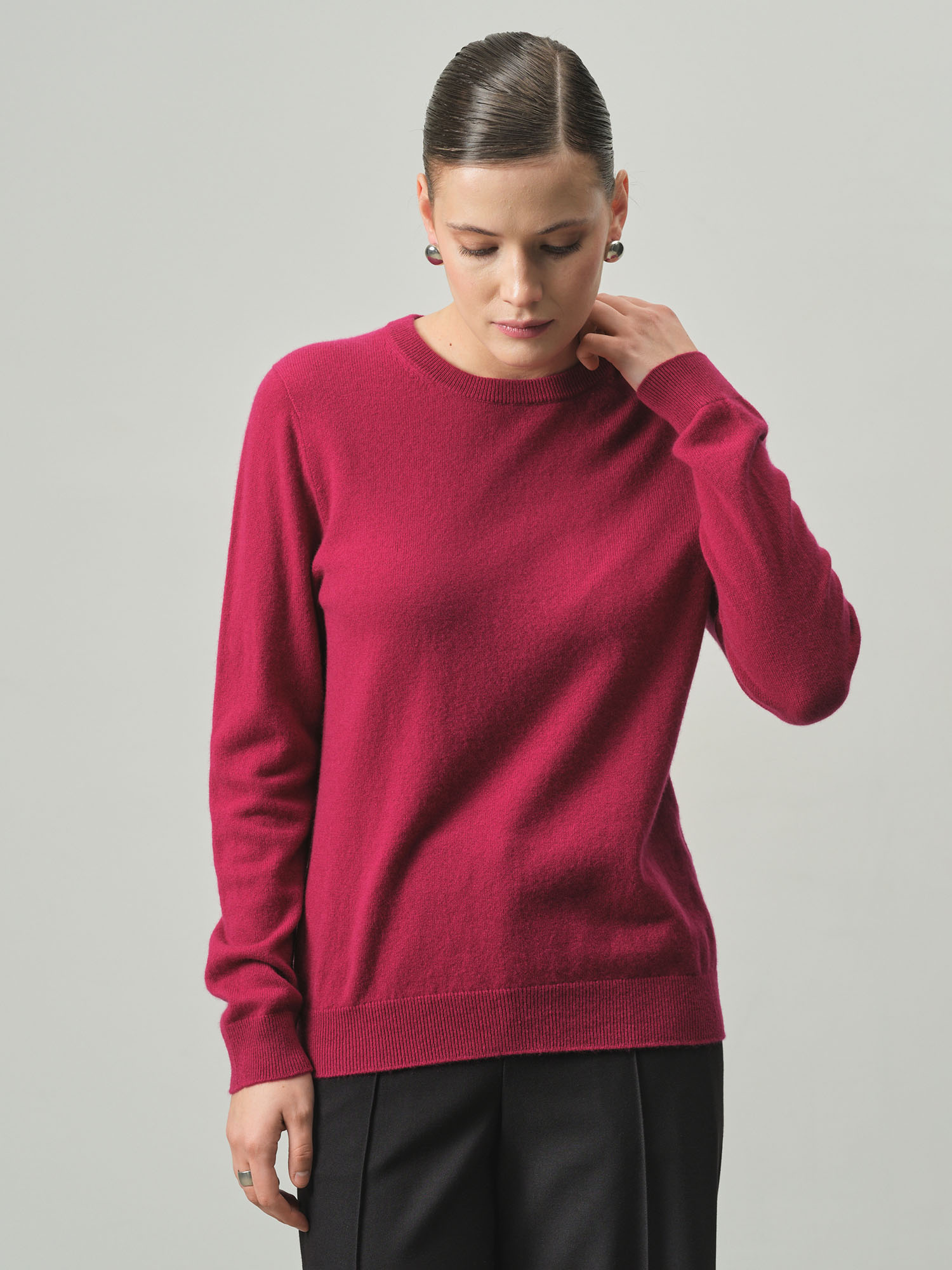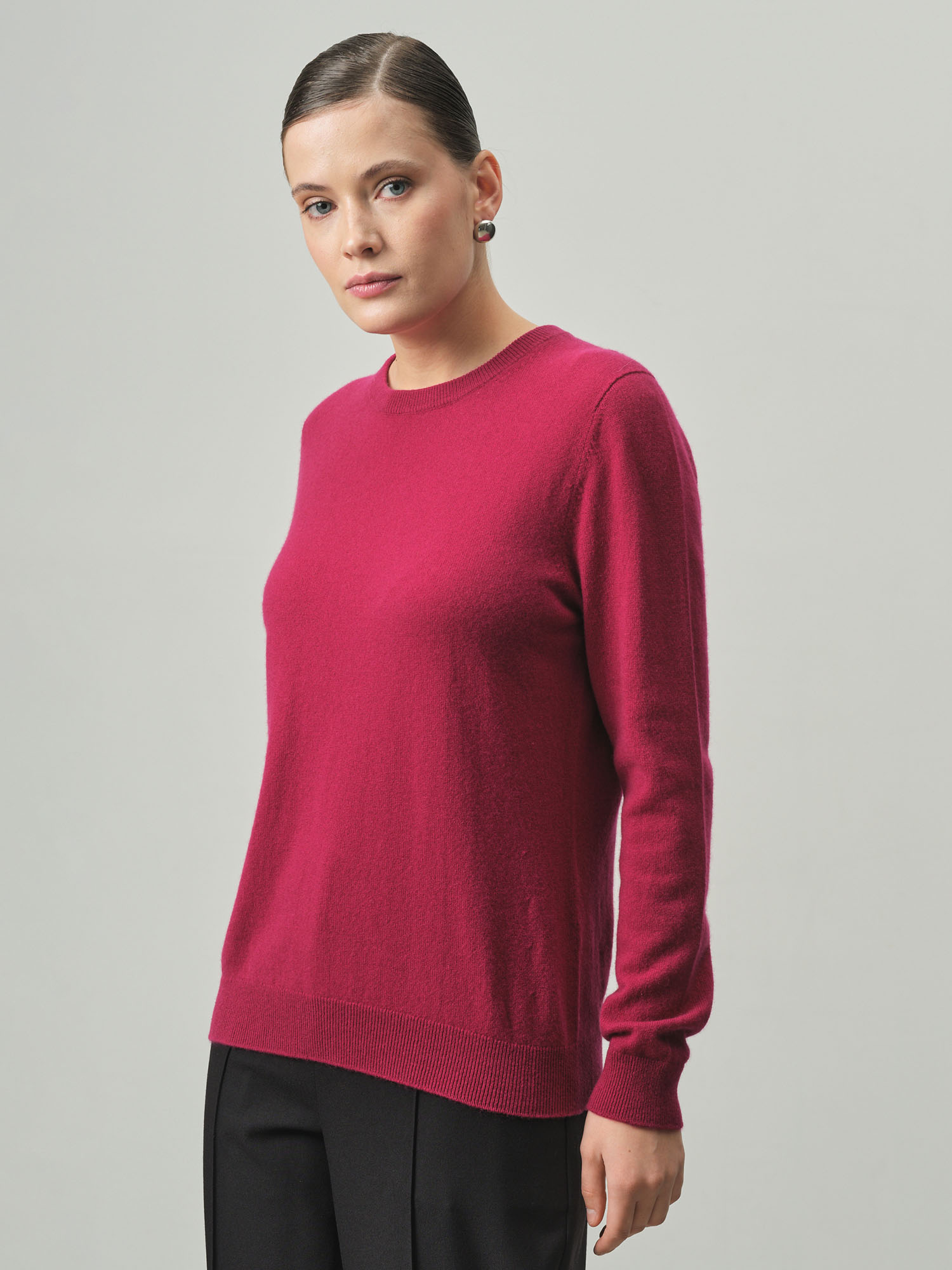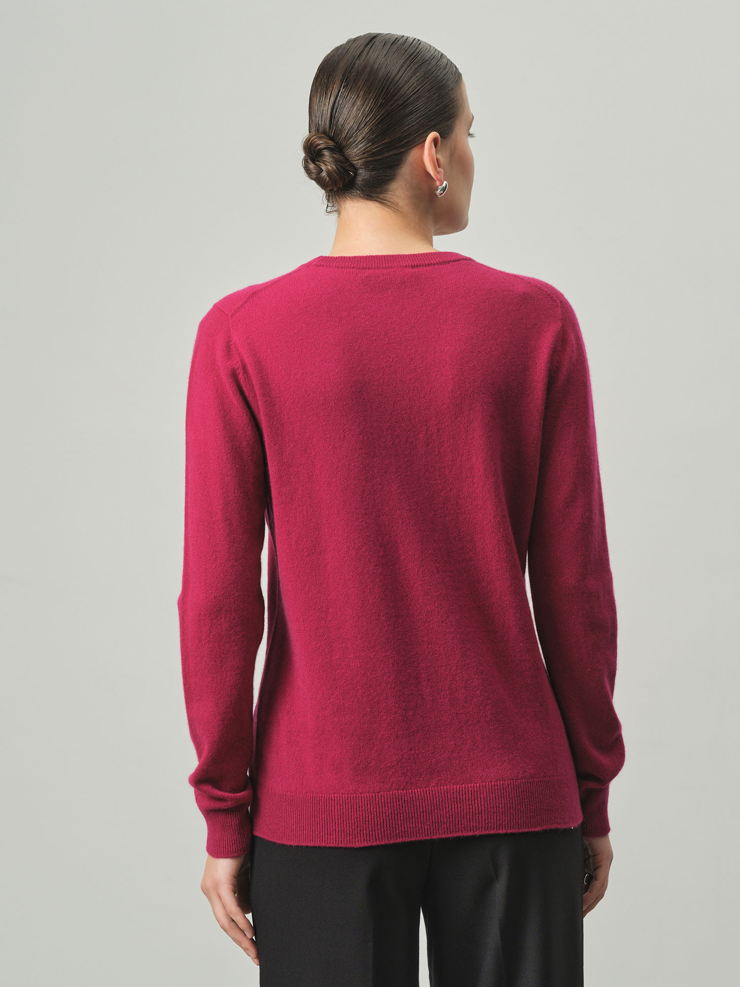 Богатый оттенок спелого баклажана добавляет образу глубину и изысканность. Этот цвет одинаково эффектно смотрится как в деловых ансамблях с юбкой-карандаш, так и в вечерних луках с шелковыми брюками или в повседневных сочетаниях с денимом. Умеренно приталенный силуэт с классическим круглым вырезом подчеркивает женственность, сохраняя при этом универсальность.