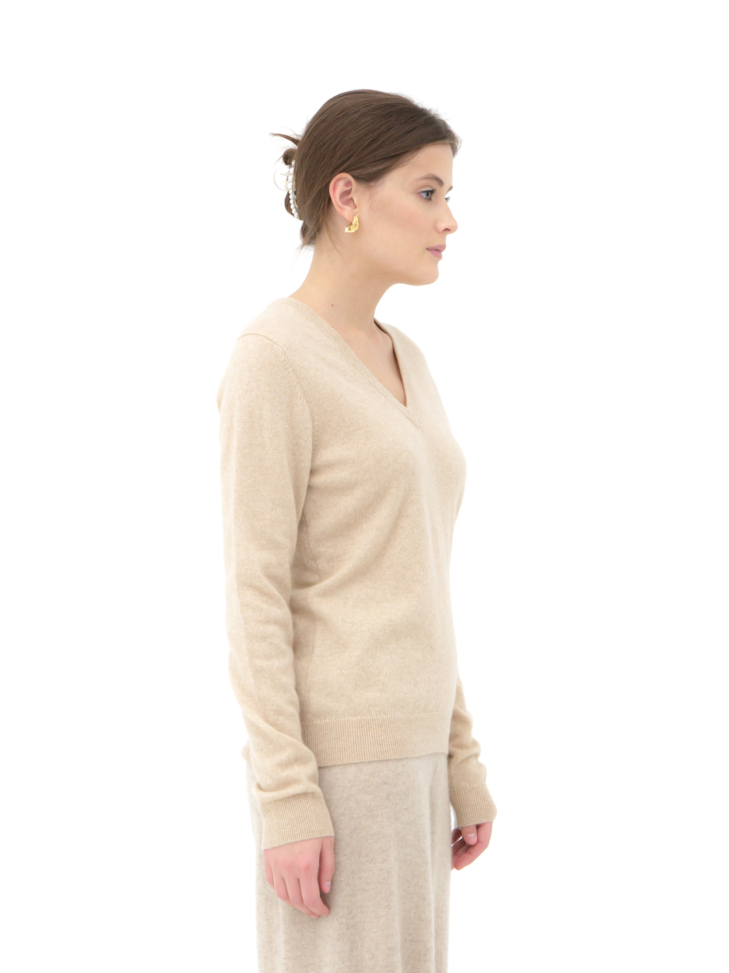 Модель выполнена в классическом прямом силуэте с аккуратным V-образным вырезом. Гладкая вязка подчёркивает благородную фактуру материала и делает изделие универсальным для разных стилей.