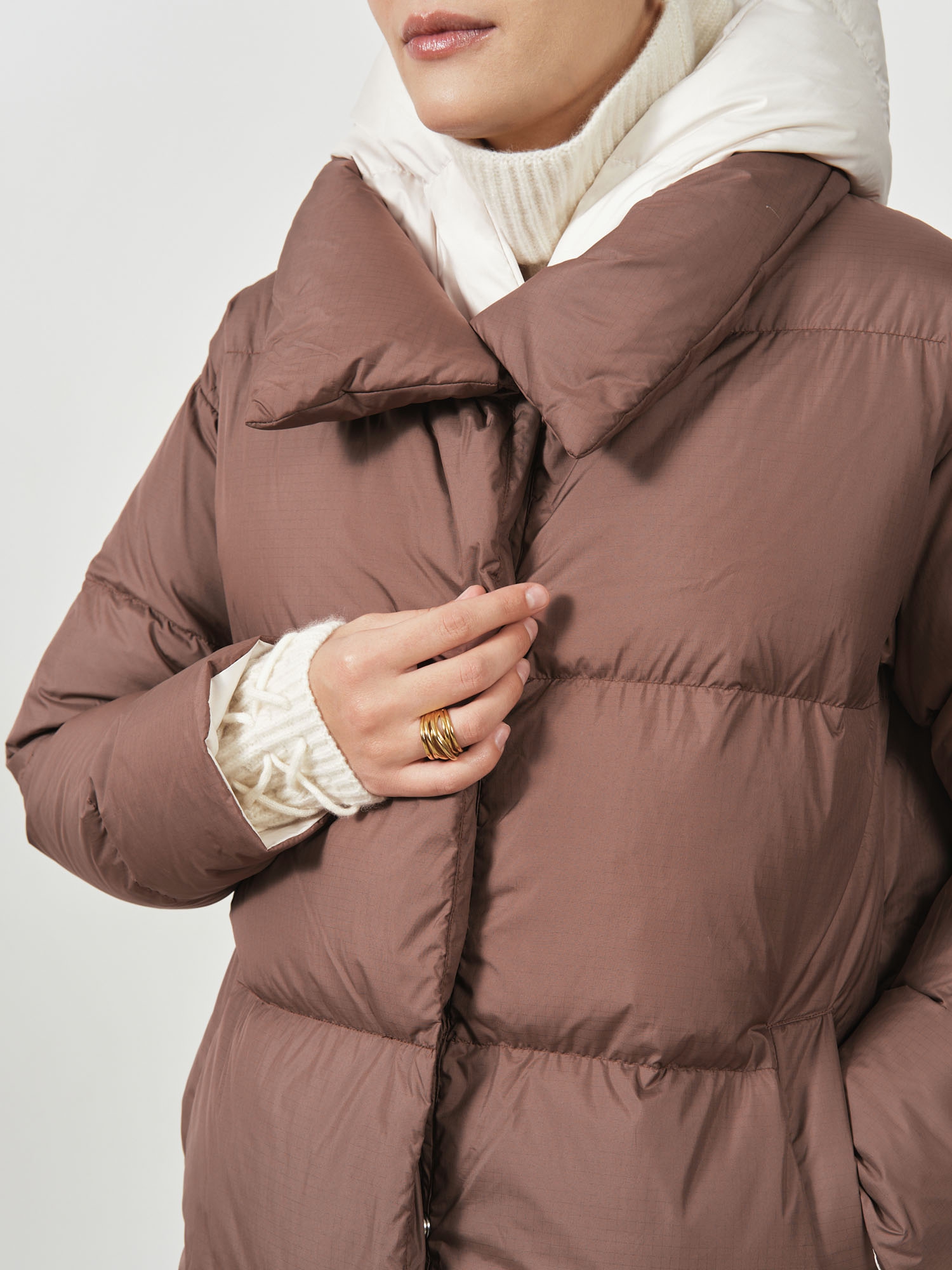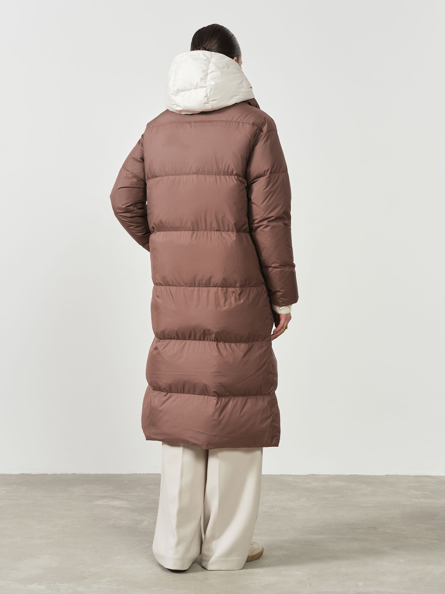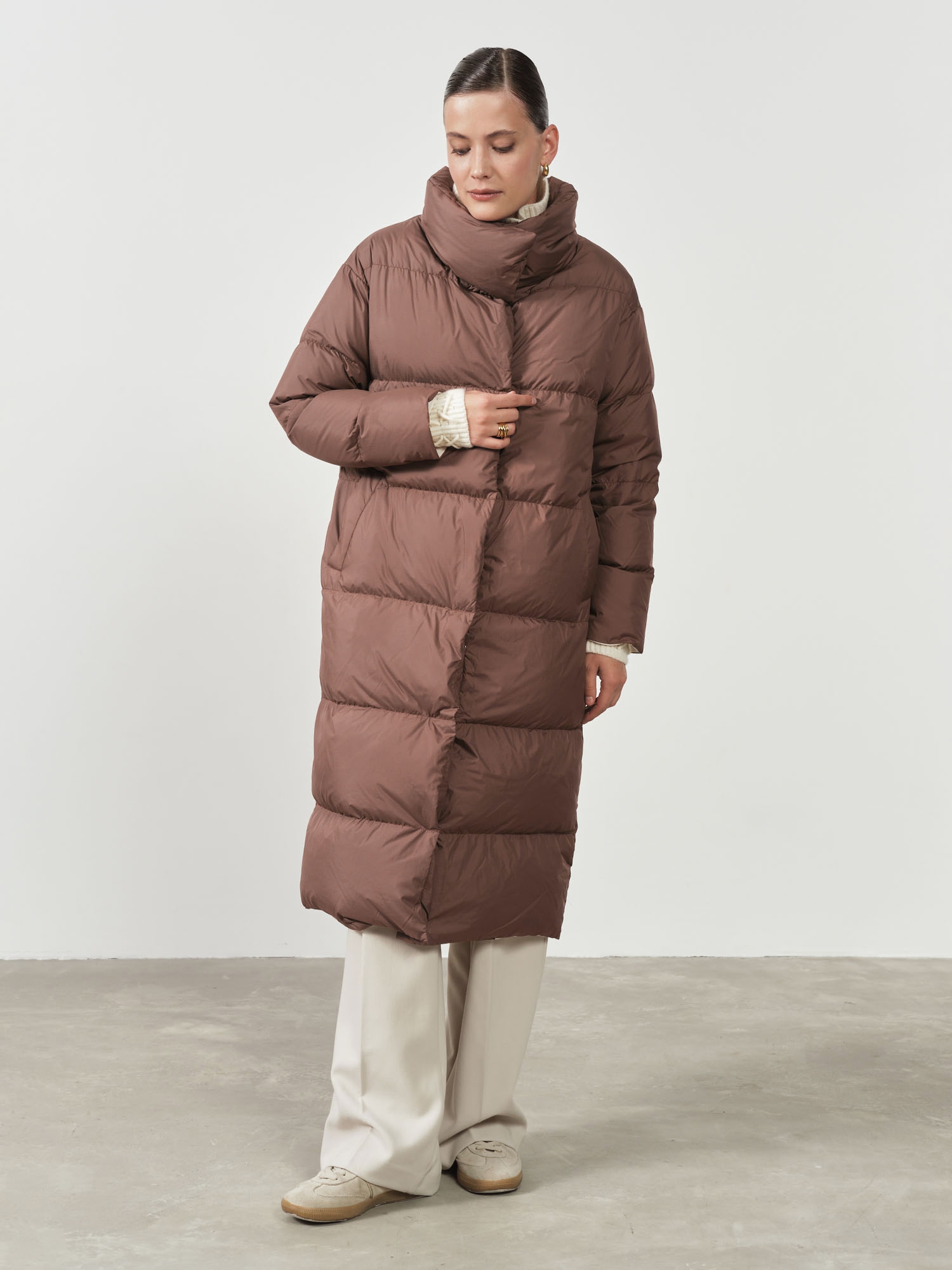 Женское удлинённое пуховое пальто в универсальном коричневом оттенке. Модель сочетает лаконичный дизайн и высокий уровень комфорта, идеально подходит для холодного сезона и повседневных образов.